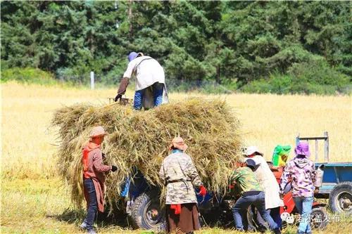 ཞིང་བ་ཚོ་སྟོན་འབྲུ་བསྡུ་བའི་ལས་ལ་བྲེལ་བཞིན་འདུག