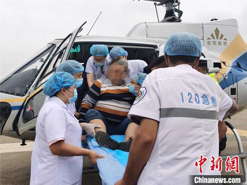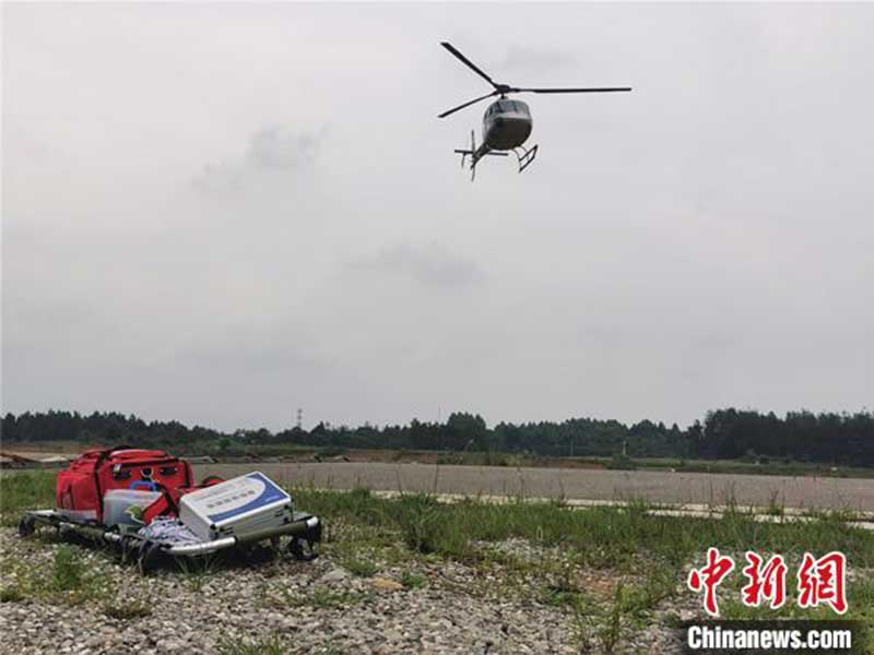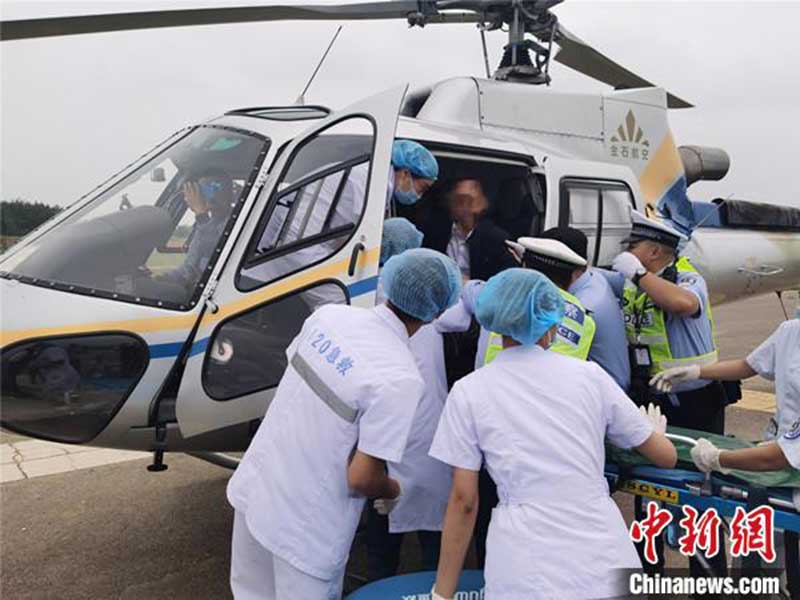 ཆུ་ཚོད་13དང་སྐར་མ་55ཡས་མས་སུ། བར་སྣང་ནས་ཐད་འཕུར་གནམ་གྲུའི་སྒྲ་གྲགས་པ་དང་། ཐད་འཕུར་གནམ་གྲུ་ཞིག་པེ་ཁྲོན་ཀུན་སྤྱོད་གནམ་ཐང་གི་བར་སྣང་དུ་འབྱོར་བ་རེད། དེ་རྗེས་ཐད་འཕུར་གནམ་གྲུ་དལ་གྱིས་བབས་པ་དང་། སྨན་དོན་མི་སྣས་སྒོ་ཁྲི་ཁྱེར་ནས་ཐད་འཕུར་གནམ་གྲུའི་སྒོ་ཁར་ཕྱིན་ཏེ་མཉམ་དུ་ནད་པ་སྒོ་ཁྲིའི་ཐོག་བཞག་ནས་དེར་ཡོད་པའི་མྱུར་སྐྱོབ་རླངས་འཁོར་ཐོག་བསྐྱལ་བ་དང་འབྲེལ། ཉེན་རྟོག་རླངས་འཁོར་གྱིས་ལམ་སྣེ་ཁྲིད་པ་བརྒྱུད་ཛ་དྲག་ངང་སྨན་ཁང་དུ་བསྐྱལ་བ་རེད།