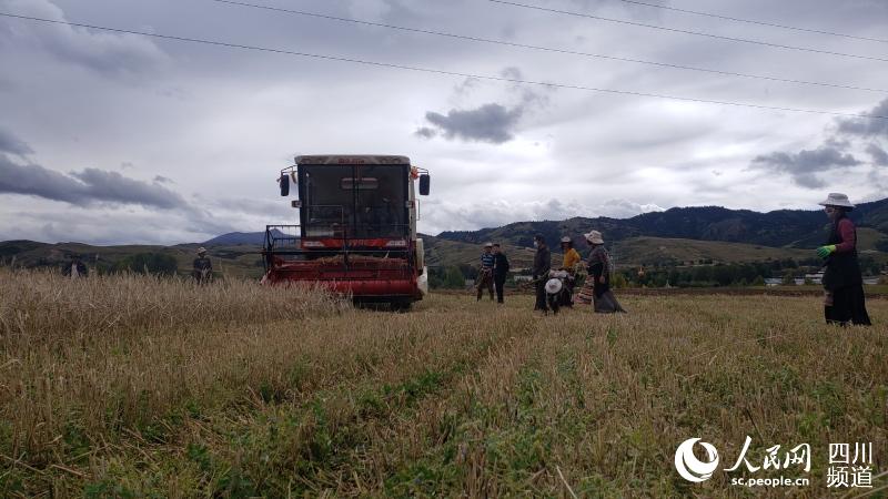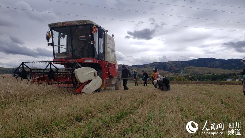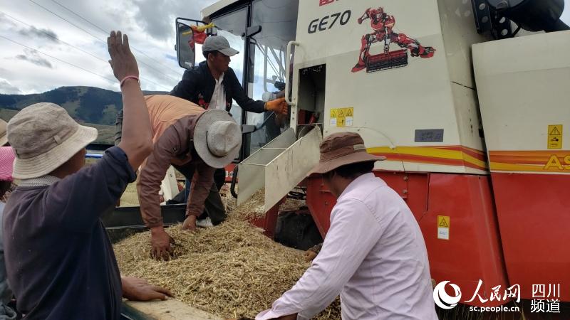 མཉམ་འབྲེལ་བརྔ་བསྡུ་འཕྲུལ་འཁོར་དང་འདྲུད་འཐེན་འཕྲུལ་འཁོར་སོགས་ཞིང་ནང་དུ་ཕར་འགྲོ་ཚུར་འོང་བྱེད་ལ། གསེར་མདོག་གི་ནས་དེའི་ནང་དུ་བསྡུ་ཞིང་། ནས་འབྲུ་རྡོག་རེ་རེ་འཕྲུལ་འཁོར་ནས་ཐོན། མཁར་ཉམས་གྲོང་ཚོའི་ཏང་ཀྲི་པུའི་ཧྲུའུ་ཅི་ཚེ་དབང་གིས“སྔོན་ཆད་ཡིན་ན། ང་ཚོའི་ཁྱིམ་ཚང་གི་རྒན་གཞོན་ཚང་མས་ལས་ཀ་ལས་དགོས་པ་མ་ཟད་ད་དུང་གནམ་གཤིས་ཡག་མིན་ལ་བལྟ་དགོས། ཉིན་འགའ་འགོར་རྗེས་ད་གཟོད་ནས་བརྔས་ནས་ཁྱིམ་དུ་ལོག་ཐུབ་པ་དང་། དེ་རྗེས་ད་དུང་མི་ཤུགས་དང་དུས་ཚོད་མང་པོ་སྤྱད་དེ་འབྲུ་རྡོག་འདོན་དགོས། ད་ལྟ་མཉམ་འབྲེལ་བརྔ་བསྡུ་འཕྲུལ་འཁོར་ཐེངས་གཅིག་གིས་ལས་ཀ་ཚང་མ་བསྒྲུབས་ནས་ཁྱིམ་དུ་དབོར་ནས་ཉི་མར་བསྐམས་ན་ཆོག”ཅེས་བརྗོད།