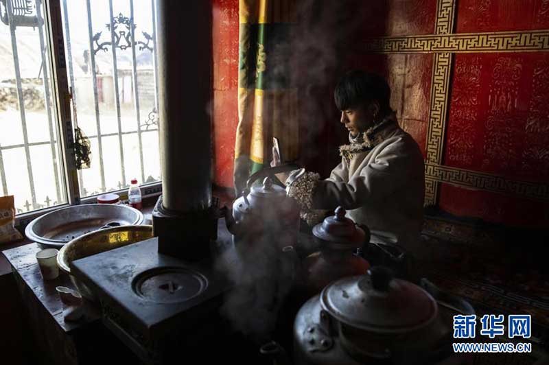 ཤིན་ཧྭ་གསར་འབྱུར་ནས་གློག་འཕྲིན་འབྱོལ་གསལ། ལི་ཐང་རྫོང་ལི་ཐང་གནའ་གྲོང་གི་ཚངས་དབྱངས་རྒྱ་མཚོའི་རྟེན་རྫས་བཤམས་མཛོད་ཁང་ཆུང་གྲས་སུ། བསྟན་འཛིན་གྱིས་སེམས་ཆུང་ངང་སྐར་ཁུང་གི་ཁྲ་ཡོལ་ཕྱེས་བཞིན་ཡོད། ཁོ་རང་གི་ཁྱིམ་དུ་ཁྲ་ཡོལ་འདི་འདྲ་ཞིག་སྒྲིག་སྦྱོར་བྱས་མི་མྱོང་བ་རེད། ས་གནས་དེ་གའི་རིག་གནས་ཡུལ་སྐོར་ཁེ་ལས་ཀྱི་ལས་མི་ཞིག་ཡིན་པའི་ངོས་ནས། འདི་ནི་བསྟན་འཛིན་གྱི་འབྱུང་འགྱུར་ལས་ཀ་བྱ་ཡུལ་གྱི་གྲས་ཤིག་ཡིན།