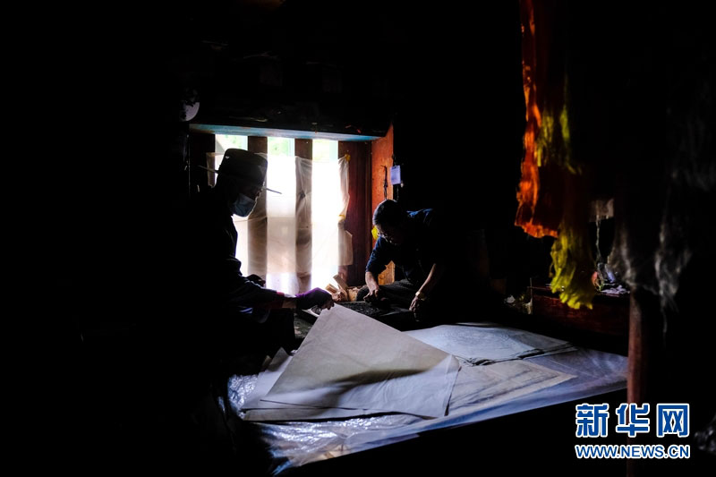 ད་ལྟའི་བར་དུ་པར་ཁང་ནང་ལ་གློག་འཐེན་མེད། རྒྱ་མཐོངས་ཀྱི་འོད་ལ་བརྟེན་ནས་དཔར་མཁན་དག་གིས་པར་འདེབས་བཞིན་ཡོད། མི་གཉིས་ཁ་གཏད་དུ་གཅིག་ཅུང་མཐོ་ས་དང་ཅིག་ཤོས་དམའ་སར་སྡོད་པ་དང་། ཁོང་གཉིས་ཀའི་བར་ལ་པར་ཤིང་བཞག་ཡོད། མཐོ་སར་སྡོད་མཁན་གྱིས་ཤོག་བུ་པར་ཤིང་གི་ངོར་ཡག་པོར་སྦྱོར་བ་དང་པར་ཤིང་ངོར་སྣག་ཚ་བྱུགས་རྒྱུའི་འགན་འཁུར་ཡོད། མི་གཞན་པ་དེས་ཕྱོགས་གཅིག་ནས་ཤོག་བུ་སྟེར་བ་དང་ཅིག་ཤོས་ནས་འགྲིལ་བུ་ཡར་མར་འགྲིལ་ནས་པར་འདེབས་པ་རེད། མི་གཉིས་ཀས་ཉིན་རེར་ཆུ་ཚོད་6ཙམ་ལས་ཀ་བྱེད་བཞིན་ཡོད་ཅིང་། ཤོག་ལྡེབ་2400དང་ཤོག་ངོས་4800པར་ཐུབ།