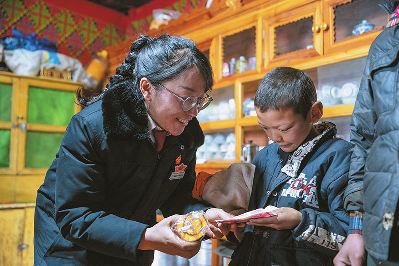 “དྲང་བདེན་གངས་ལྷ་མེ་ཏོག”བུད་མེད་འདྲི་གཅོད་ཚོགས་པའི་ཁྲིམས་དཔོན་ཚེ་རིང་ཆོས་སྐྱིད་ཞུ་སྦྱོར་སྔ་མའི་ཁྱིམ་དུ་བསྐྱོད་དེ་ཕྲུ་གུར་སློབ་རོགས་དངུལ་སྤྲོད་བཞིན་པ།